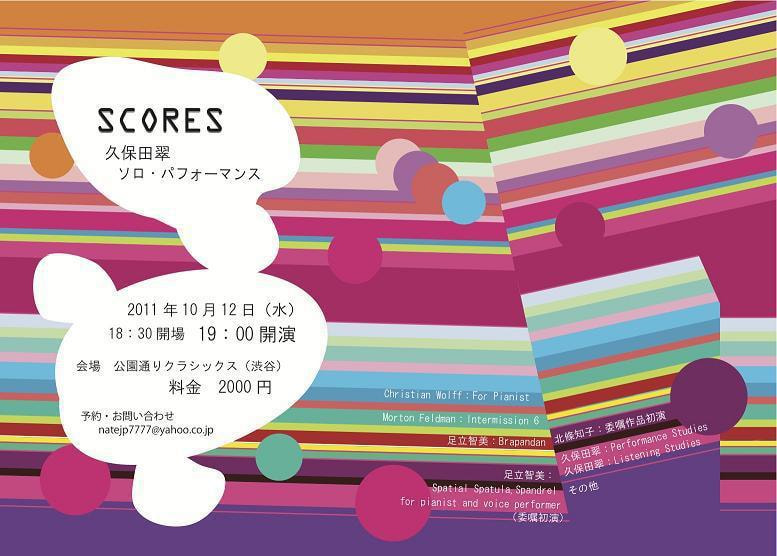 公園通りクラシックスで行われた初のソロ・パフォーマンス。アメリカ実験音楽の作品を中心とし、自身のパフォーマンス作品初演や、足立智美氏や北條知子氏への委嘱新作初演も行った。楽譜の読解に関する様々な可能性を探り、読譜とパフォーマンスの新たな関係性の構築を試みた。
